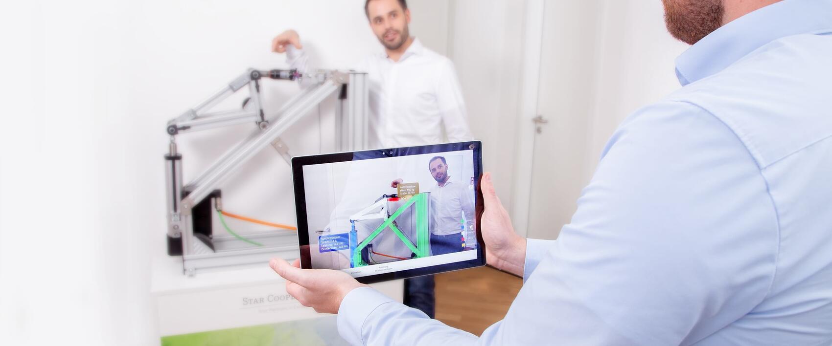 Gleichzeitig erarbeiten unsere Experten für Sie Analysen- und Interaktionen-Modelle mit dem digitalen Zwilling, die Sie auf allen gängigen Ausgabe-Medien testen. So probieren Sie zum Beispiel verschiedene Prüfgrößen unter virtuellen Bedingungen aus und leiten daraus wichtige Informationen für Ihre realen Produkte ab. In einer VR-Sitzung etwa betrachten Sie ein Produkt per Interaktions-Modell realitätsnah. Dabei sind Sie unabhängig von Zeit und Ort. Oder Sie binden den digitalen Zwilling mittels Augmented Reality (AR) oder 3D Scan in reale Umgebungen ein – und gewinnen daraus wertvolle Erkenntnisse.