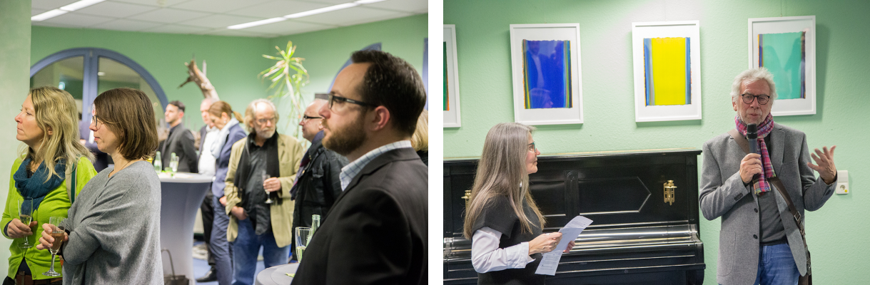 Mit dem Farb- und Klangraum seiner materialintensiven Werke konnte der malende Jazzliebhaber Harald Huss auch die STAR Insight-Gäste in seinen Bann ziehen. In legerer Atmosphäre bei leckeren Häppchen und interessanten Gesprächen durften die Teilnehmer den Künstler persönlich kennenlernen und die erfolgreiche Ausstellung „Hintergrundrauschen“ bewusst auf sich wirken lassen. Der bunte und kulturelle Abend machte nicht nur bei den Kunstliebhabern unter den Gästen Appetit auf weitere Veranstaltungen im Rahmen der STAR Insight-Reihe.