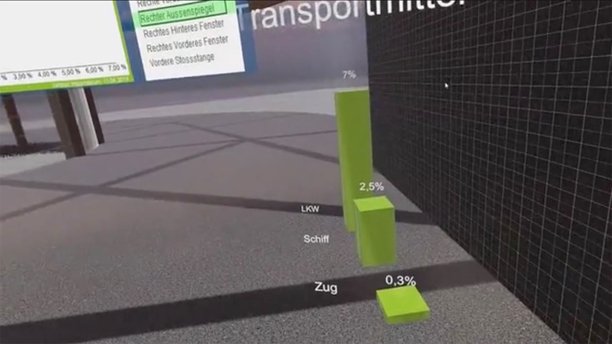 BI und VR schaffen mit ihrer kombinierten Art des Reportings Transparenz in der Logistik. Modelle von Fahrzeugen oder anderen Transportgütern visualisieren Kennzahlen wie Schadensquoten, Schadenskosten oder Gesamtkosten, die sich aus verschiedenen Faktoren ergeben, und erweitern so herkömmliche Datenreihen und Dashboards. Das konkrete Fallbeispiel der VR4BI-Anwendung erläutert die Vorteile von VR im Business-Alltag sehr anschaulich.